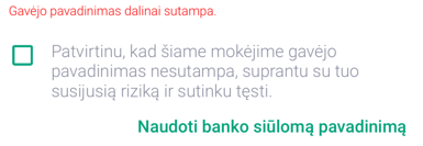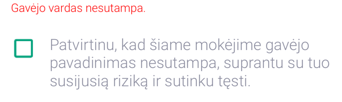 - Nurodytas gavėjo pavadinimas nesutampa – sąskaita gali priklausyti kitam asmeniui. Rekomenduojame dar kartą patikrinti gavėjo duomenis ir neatlikti mokėjimo kol neįsitikinsite. Jei mokėjimą vykdysite toliau turėsite pažymėti, kad „Patvirtinu, kad šiame mokėjime gavėjo pavadinimas nesutampa, suprantu su tuo susijusią riziką ir sutinku tęsti„: